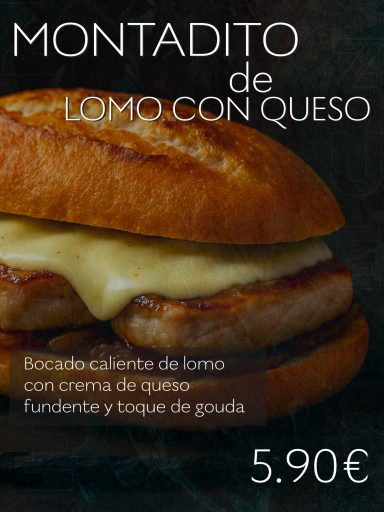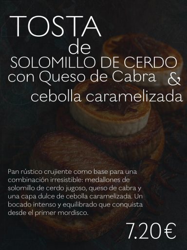 TOSTA DE SOLOMILLO DE CERDO CON QUESO DE CABRA Y CEBOLLA CARAMELIZADA. 7.20