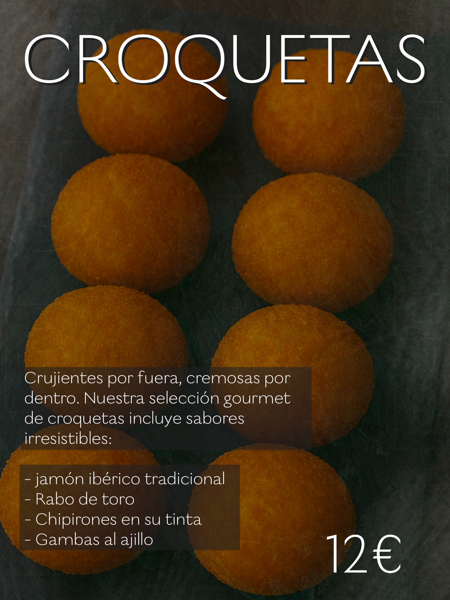 Croquetas (Jamón, Rabo de toro, chipirones en su tinta, gambas al ajillo........................................12